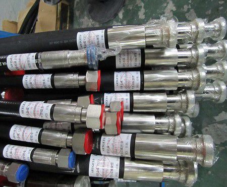 液壓軟管主要由耐液體的內膠層、中膠層、2或4或6層鋼絲纏繞增強層、外膠層組成,內膠層具有使輸送介質承受壓力,保護鋼絲不受侵蝕的作用,外膠層保護鋼絲不受損傷,鋼絲層是骨架材料起增強作用。